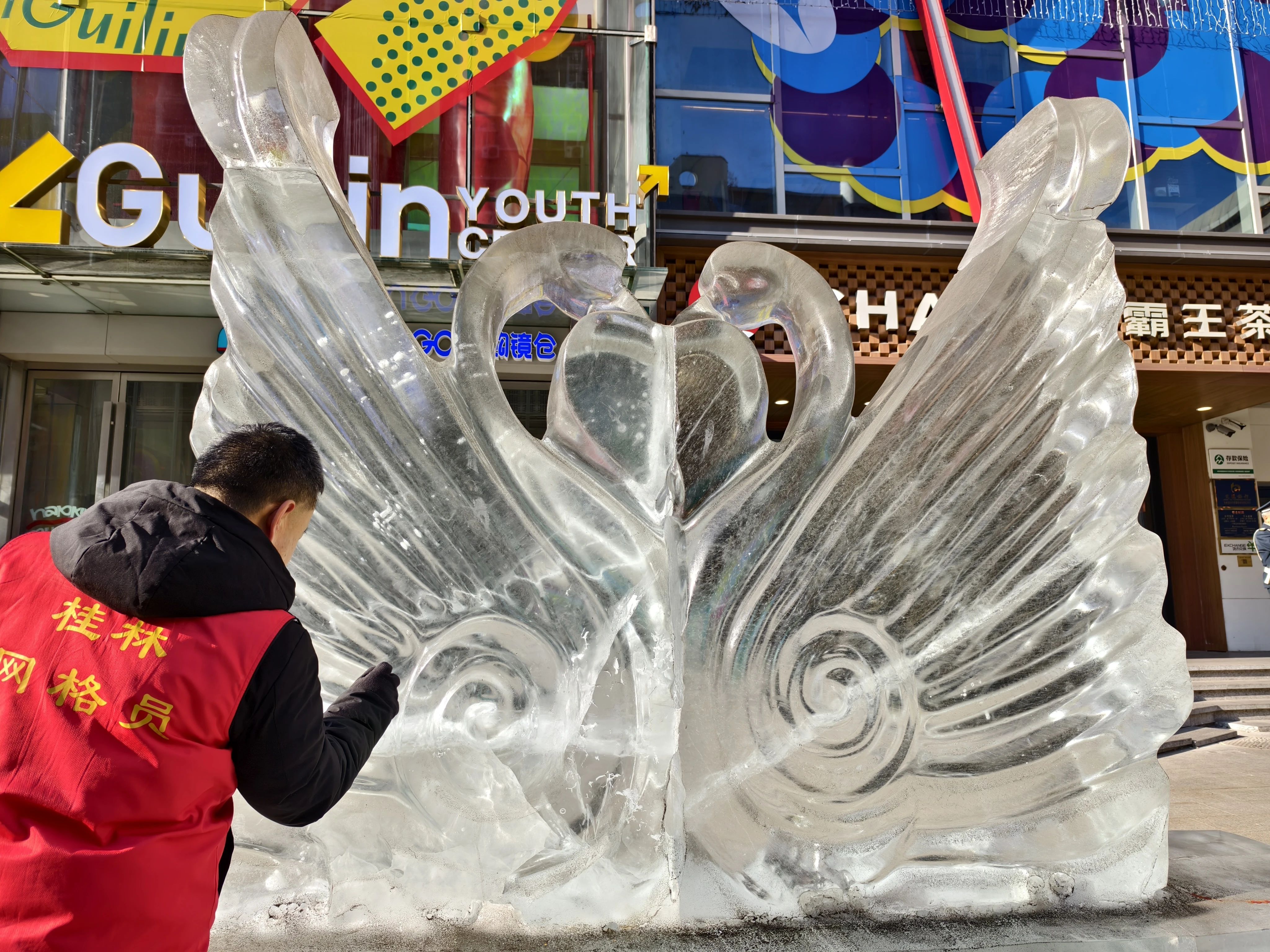 为保障桂林商圈冰雕作品的清洁和完好,志愿者们分工明确,每日不定时巡查,擦拭冰雕上面的灰尘,检查灯光线路是否正常,对有残缺损坏的冰雕及时上报,并配合施工方进行修缮。华灯初上时,徜徉西桂林商圈,在灯光的映照下,形态各异的冰雕带来美好的视觉体验,街路两侧的灯饰装点出春节即将到来的温馨氛围。
