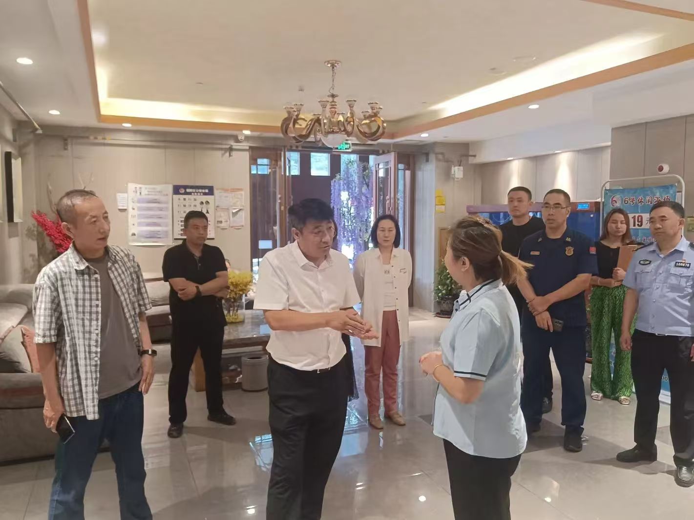在洗浴中心,尹中峰针对消防设施维护、安全出口、应急疏散指示标识等重点部位进行检查。强调要持续强化隐患排查整治,严防各类事故发生。