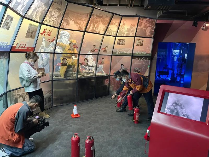 演练现场,火情设定为博物馆一楼展区因线路短路引发火灾,烟雾逐步扩散,弥漫整个展区。工作人员按照事先制定的安全生产综合应急预案,采取启动火警处理程序、对火灾进行初期扑救、拨打“119”“120”报警电话、抢救伤者等处理方式,最终成功扑灭大火。