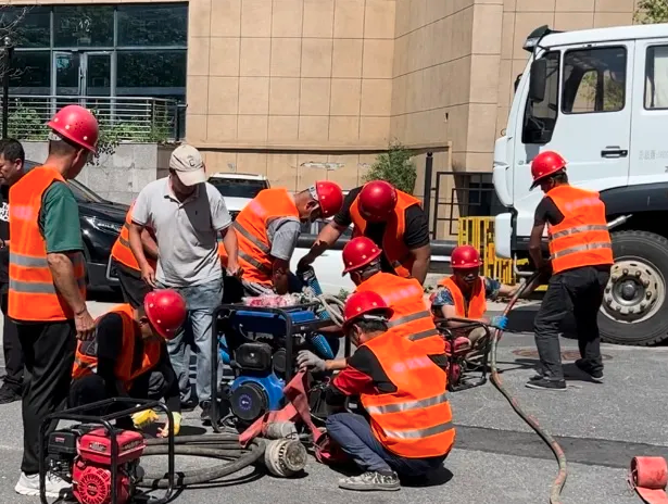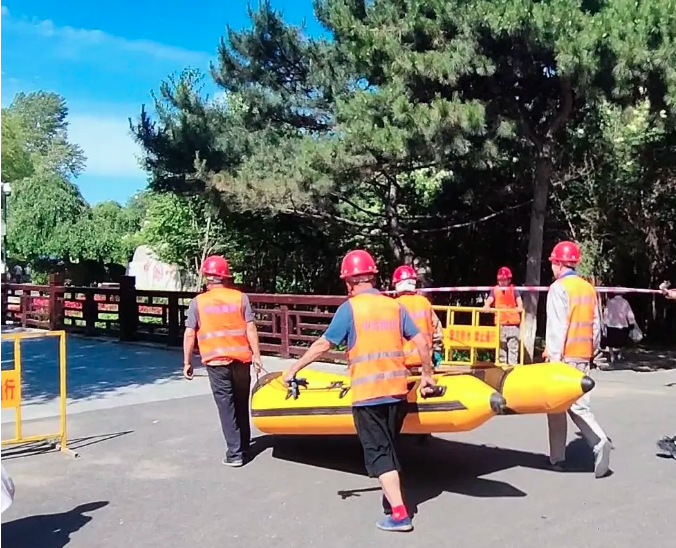 演练分为三个阶段进行。首先是预警响应阶段,模拟接收到气象预警信息后,立即启动应急预案,各小组迅速进入工作状态,做好抢险准备。接着是现场评估与隔离阶段,队员们迅速对受灾区域进行勘查,明确危险区域,设置警示标志,并引导行人和车辆避险。最后是排水与救援阶段,队员们利用抽水设备高效排水,同时展开模拟救援行动,使用橡皮艇等工具对“受困群众”进行安全转移。